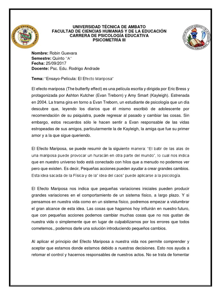 José María Aresté 27 diciembre 1995 Michael Crichton puso de moda con Parque Jurásico la teoría del caos que a veces se explica con el llamado efecto mariposa. Las cualeshan desaparecido en el olvido desde pequeño tiene que recurrir a un psicólogo que lo obliga a escribir en un diario lo que le pasa día a día. La película refiere a todo esto Evan desde su infancia sufre ciertos.