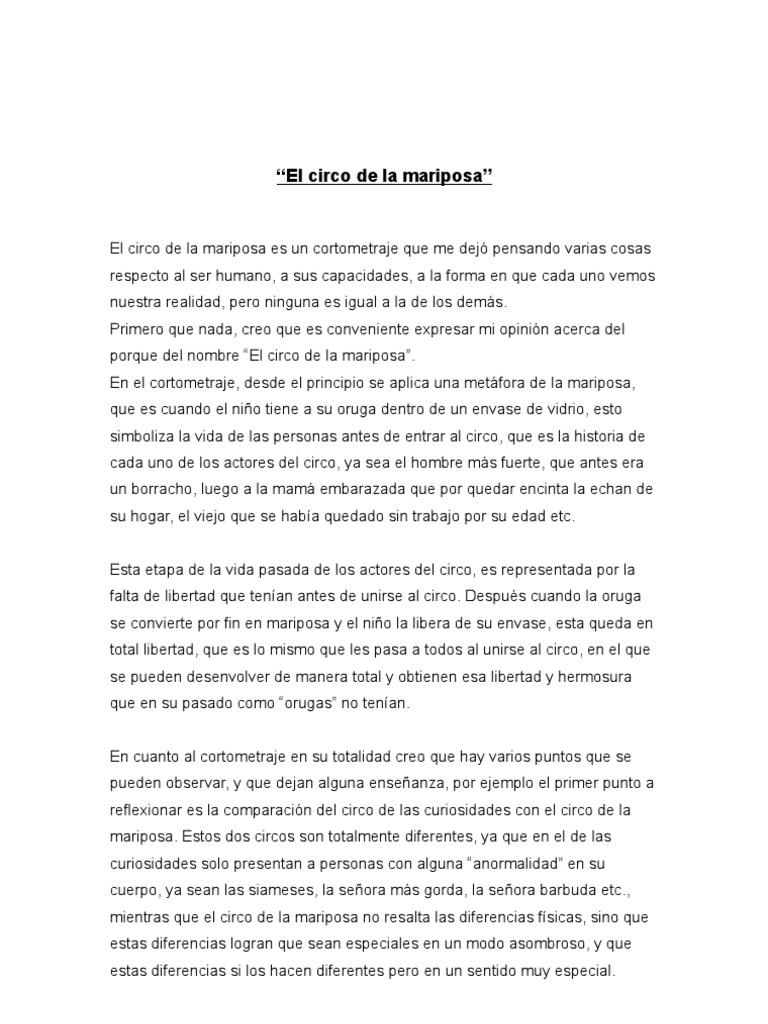 MARCO POLÍTICO PEDAGÓGICO Análisis Corto El CIRCO DE LAS MARIPOSAS Representa un nuevo contexto educativo en el que se brinda el apoyo a personas con capacidades diferentes y se le permite el desarrollo de sus potencialidades. De reflexión sobre la relación entre desarrollo y educación partiendo del cortometraje quotel circo de las mariposasquot. La concepción de Will sobre el circo no es la misma que la que impera en el Circo de la Mariposa.