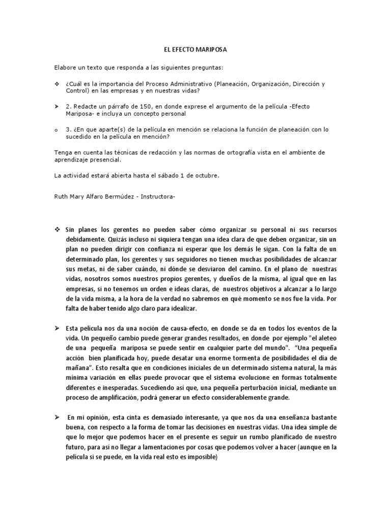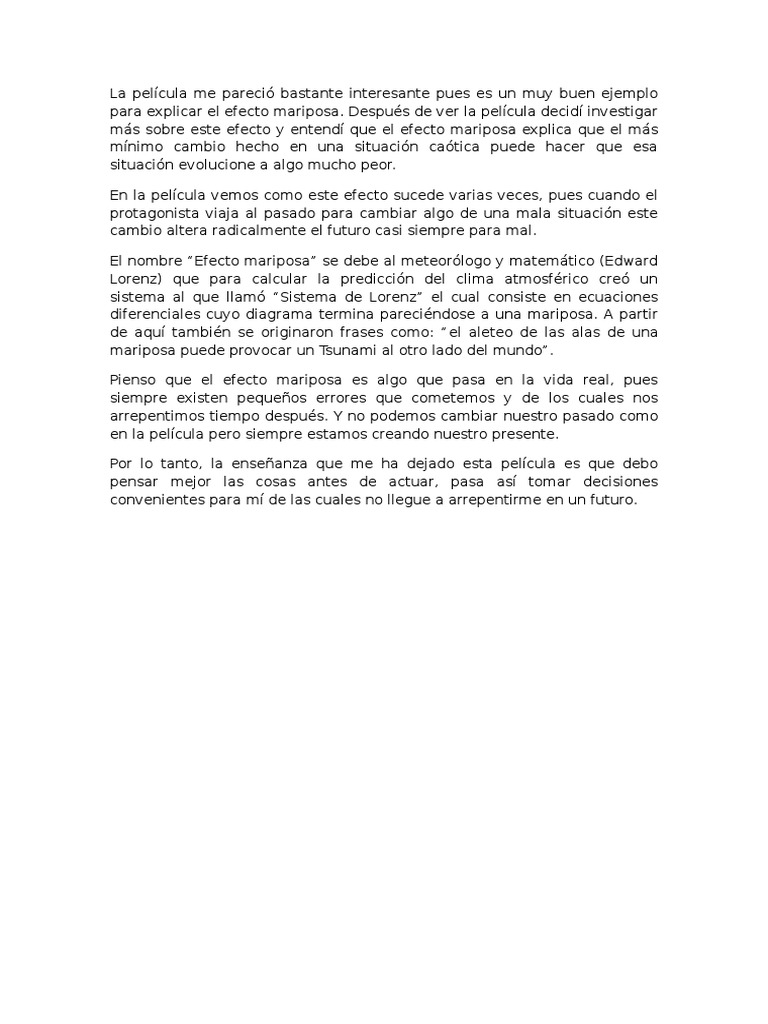 Ensayo de la pelicula efecto mariposa. Su infancia ha sido marcada por acontecimientos muy poco agradables lo que ha probocado que cayeran en el olvido incapazya de recordar nada. Mejores alternativas frente a. Ensayo por Leticia Cantoral.