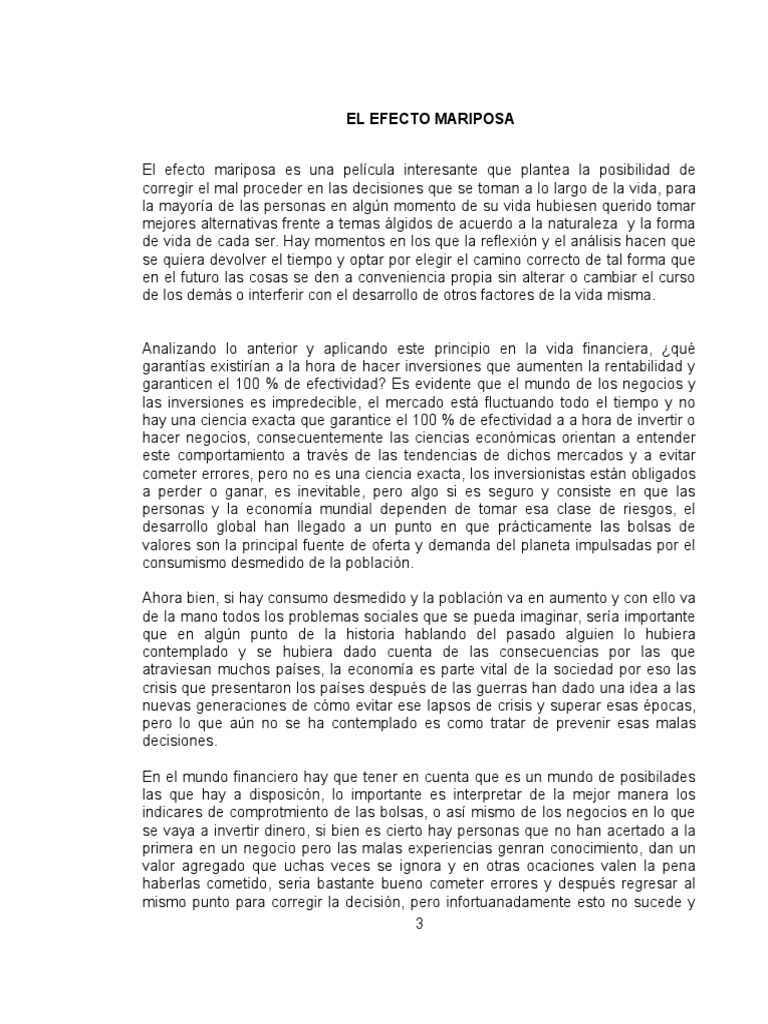 INDICE Portada 1 Índice 2 Introducción 3 Efecto Mariposa- Teoría del caos 4 Conclusión 8 2 f INTRODUCCIÓN El efecto mariposa es un concepto que hace referencia a la noción del tiempo a las condiciones iniciales dentro del marco de la teoría del caos. En la película el efecto mariposa se observa que por una causa aparentemente irrelevante se pueden desencadenar consecuencias impredecibles descontroladas y amplificadas en estos momentos depende de la persona que realice la acción ya que algunos seres humanos pueden guiarse por las emociones o por la lógica. 5 1113 palabras Publicado.