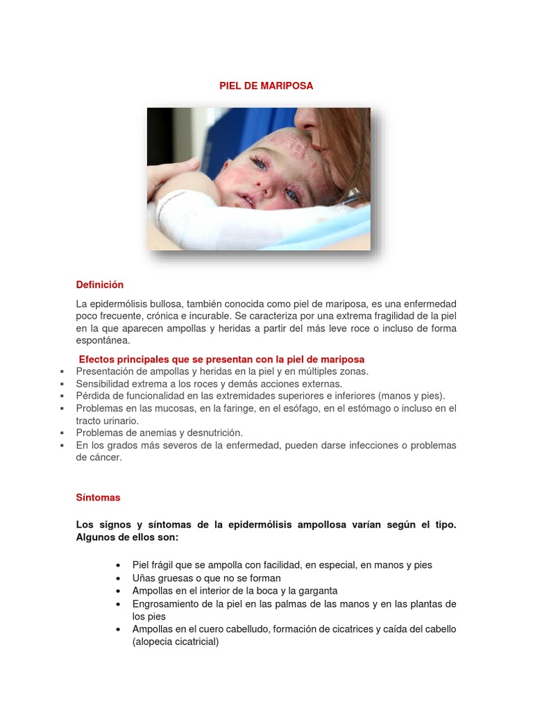 Piel de mariposa pdf. La epidermólisis ampollosa EA es una enfermedad que engloba un grupo de desórdenes determinados genéticamente y que se caracterizan por la excesiva fragilidad de la piel y las mucosas ante traumas mecánicos mínimos. A María Eugenia madre de Luis por darnos sin ella saberlo- un empujón con toda la información que nos transmitió cuando la entrevistamos. El pronóstico es variable pero suele ser grave.